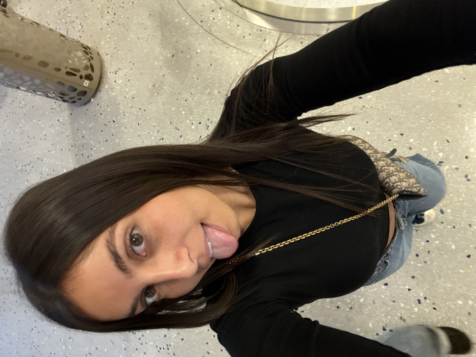 A female subject is depicted from a high-angle perspective, looking directly into the camera with her tongue extended. She possesses long, dark brown hair, brown eyes, and a fair complexion. She is dressed in a black long-sleeved crop top and light blue jeans. A beige and brown monogrammed handbag with a gold-colored chain strap is slung across her body. Partially visible footwear includes a dark shoe on the left and a light-colored sneaker on the right. The environment features a light-colored terrazzo-style floor speckled with white, grey, and dark blue flecks. In the upper right quadrant, a perforated, cylindrical beige object, possibly a waste receptacle or planter, bearing a "48" label, is present. A curved, reflective surface is visible in the lower right background. The scene is set indoors within a public space in Saint-Laurent-du-Var, France.