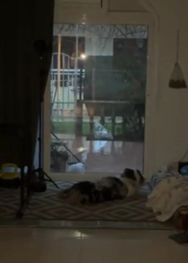 A stationary, full shot shows a dog lying on a rug inside a home. The dog is mostly white with spots of black and brown fur. The dog rolls onto its back and wiggles on the rug. Behind the dog is a sliding glass door leading to an outdoor space, which appears to be wet from rain. Outside, the viewer can see a white fence and some greenery. To the left of the door is a dark curtain and a microphone stand. To the right of the door is a white wall with a hanging decoration and some items on the floor. The floor inside the house is tiled.