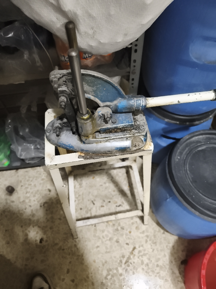 This image, taken in At-Tall, Syria, depicts a close-up view of a manual press or crimping tool positioned on a small, white metal stand