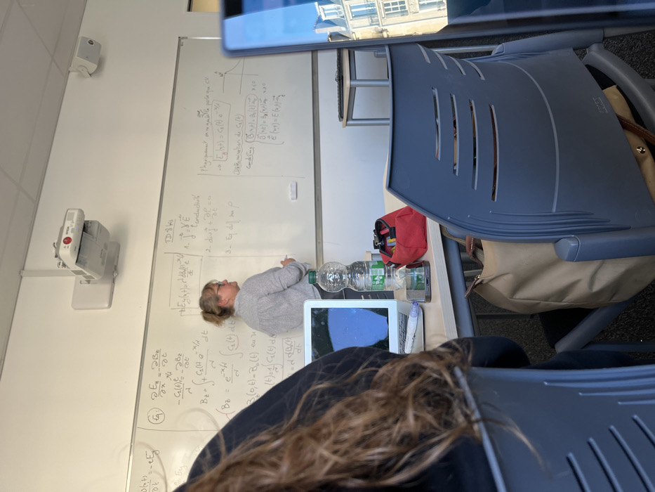 The image captures an interior classroom scene within an educational institution in Paris, France. A female instructor, with blonde hair tied back and wearing glasses and a light-colored shirt, stands at the front of the room, facing right, and is actively writing mathematical equations and formulas in French on a large white whiteboard. The whiteboard content includes expressions with derivatives, integrals, and variables such as E, B, t, x, y, z, and ρ, along with titles like "TD 8 Ho" and "Conductivité." Above the whiteboard, a white ceiling-mounted projector and a white speaker are affixed to the plain white wall. The perspective is from a student's desk, looking towards the front of the classroom. In the immediate foreground on the left, the back of a student's head and shoulders are visible, characterized by long, wavy brown hair. On a light-colored desk in the mid-ground, an open silver laptop displays a dark, reflective screen. Beside the laptop are a clear plastic bottle of Vittel mineral water, a red fabric pencil case, a black smartphone lying flat, and a white pen with a light blue cap. A beige/tan handbag hangs from the back of a grey plastic chair in the foreground. Significantly, the screen of another laptop, partially visible on the right mid-ground, reflects the distinct facade of a multi-story Parisian Haussmannian building. This reflection shows classic light stone architecture, multiple windows, and decorative wrought-iron balconies, indicating the urban environment of Paris outside the building.