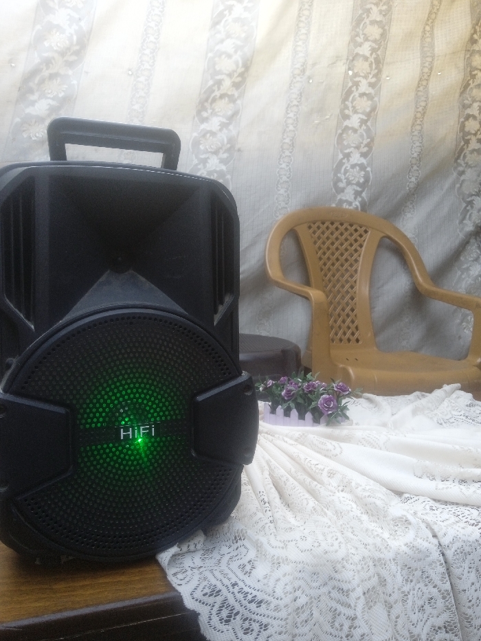 - "A black portable speaker with a top handle is positioned on a dark wooden surface, partially covered by a white lace tablecloth that extends to the right" by FM-cV3b62, licensed under CC BY 4.0