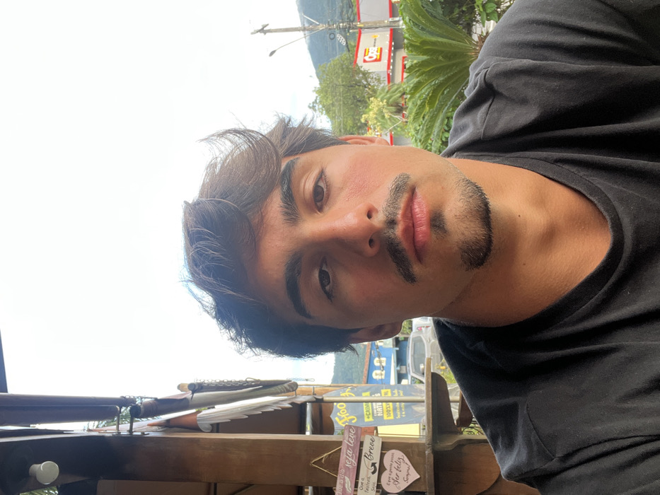 A young adult male, appearing to be in his 20s or early 30s, is centered in a close-up, eye-level shot
