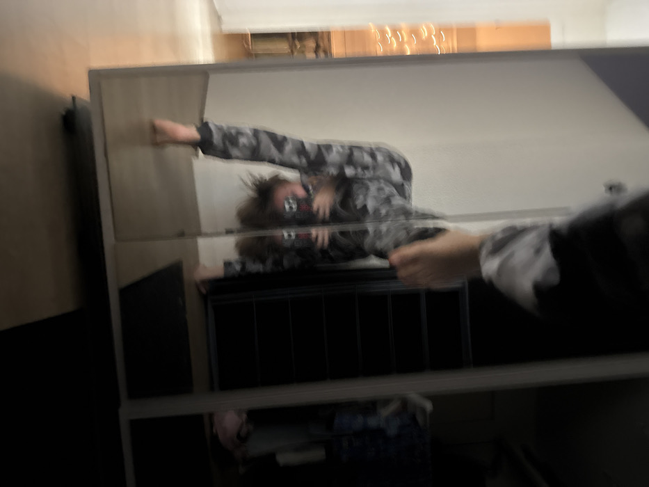 A blurry, distorted image shows a person reflected in a multi-tiered mirrored cabinet. The individual, wearing a patterned garment and a mask, is leaning forward, their hands seemingly touching the mirrored surface. The reflection also shows a black cabinet or shelf behind the person. The surrounding environment is out of focus, revealing glimpses of a wall and other furniture. The overall composition is unclear due to the motion blur and reflections.
