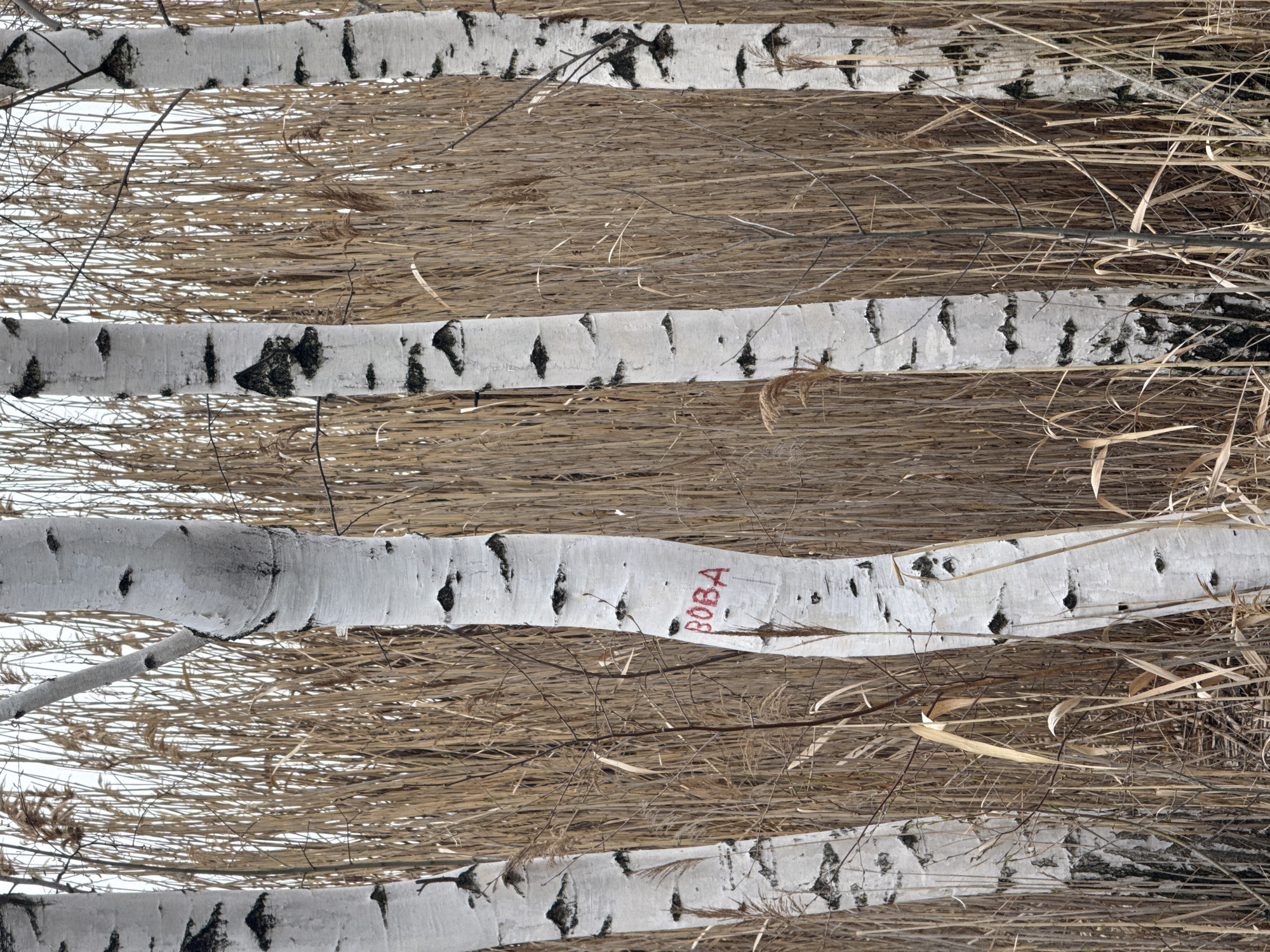 The image presents a close-up view of a row of birch trees intermixed with dry reeds or grasses