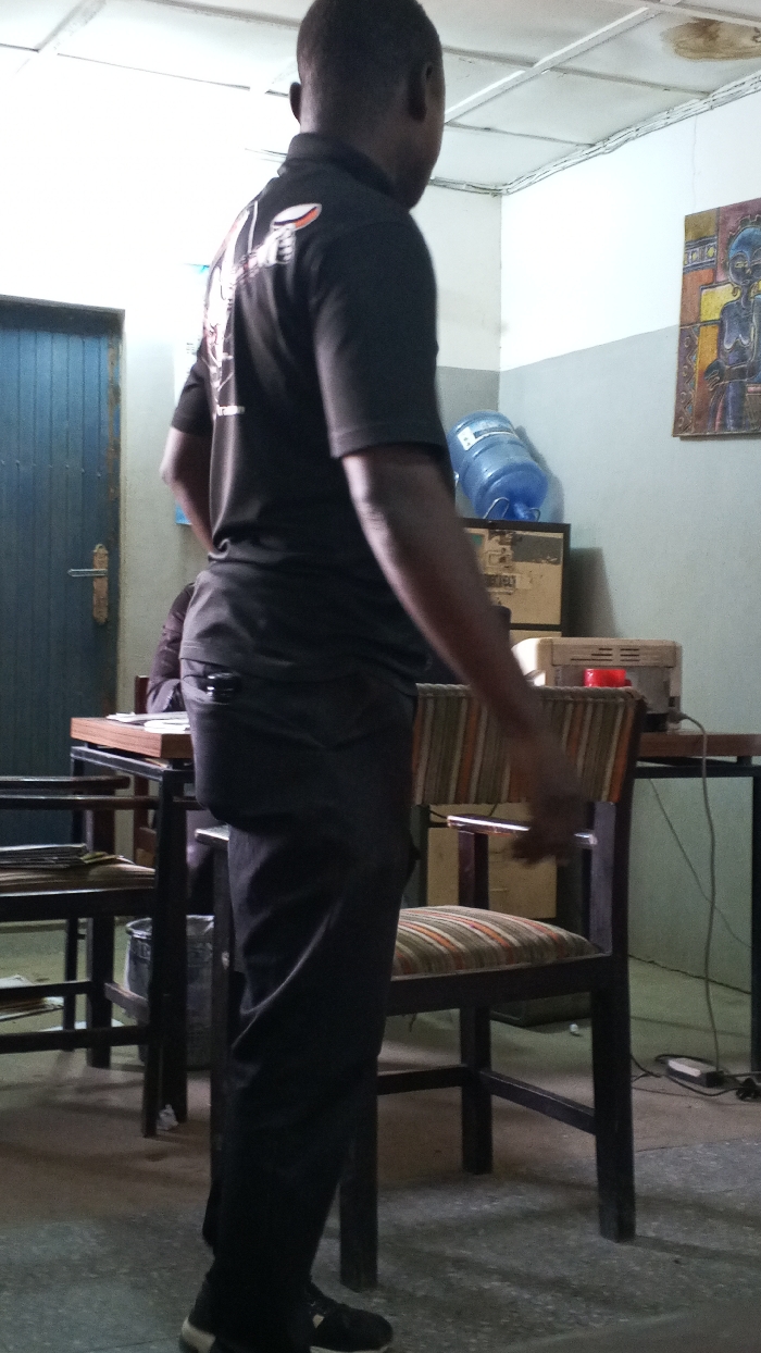 An indoor scene in Dakata, Nigeria, depicts an adult male of African descent, viewed from behind and slightly to the right, standing within a room. He wears a black short-sleeved polo shirt with a "PEPSI" logo visible on the back, black trousers, and black sneakers with white soles. A dark object, possibly a mobile phone, is partially visible in his right rear trouser pocket. His right hand is blurred, suggesting minor motion. The room features light-colored walls, with a darker grey lower section, and a grid-panel ceiling exhibiting multiple circular brown water stains. Exposed white electrical wiring runs along the wall-ceiling joint. The floor is grey. In the mid-ground, a dark-stained wooden table to the left holds papers, and a partially obscured individual is seated behind it. A wooden chair with a striped fabric seat and backrest (orange, green, and beige) is positioned to the right of the standing male. In the background right, another dark-stained wooden table holds a light-colored office machine, likely a printer, and a large blue plastic water dispenser bottle. Cables are present on the floor. A dark blue wooden panel door with a gold-colored handle is located on the far left. A framed artwork, depicting a stylized blue-skinned human figure with yellow accents, hangs on the upper right wall.