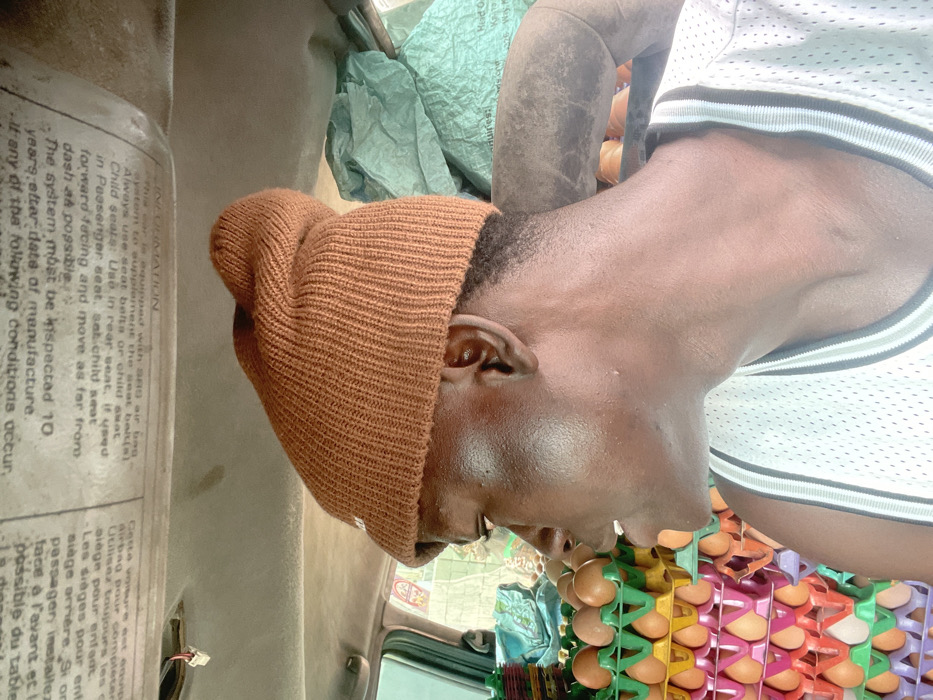 An individual, appearing to be male, is depicted in a right-profile view, seated inside a vehicle in what is identified as Langbasa, Nigeria. The individual wears a brown knitted beanie and a white mesh tank top with black trim. Their head is turned slightly to the left, showing the left side of their face and neck. To the left of the individual, stacks of colorful plastic egg crates (green, yellow, orange, pink, purple, white) filled with brown chicken eggs are visible. The vehicle's interior headliner, light-colored and textured, displays printed text in English and French, indicative of instructional or warning labels, such as "INFORMATION" and references to child seats and airbags. Behind the individual's right shoulder, a crumpled green plastic bag and a large, dark, pipe-like or rolled object are present. A vehicle window is partially visible on the far left, revealing an indistinct outdoor background.
