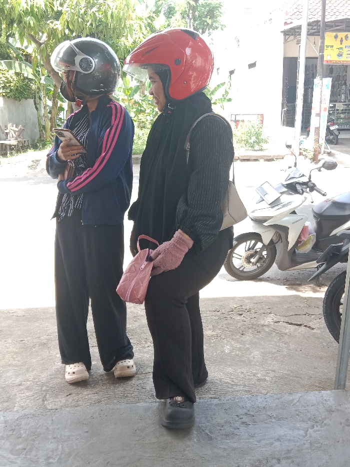 Two people stand on a concrete surface. The person on the left wears a dark helmet, blue jacket with pink stripes, black pants, and white clogs, holding a phone. The person on the right wears a red helmet, black hijab, striped shirt, black pants, and dark shoes, carrying a pink bag and a beige purse. Motorcycles are parked behind them. A building is visible in the background.