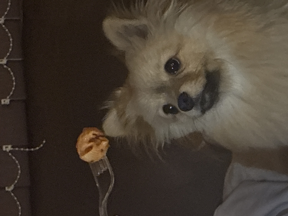 An indoor scene depicts a small, fluffy, light-colored dog with dark eyes and nose, looking upwards and slightly to its left. A clear plastic fork is positioned above the dog's head, held by an unseen individual, presenting a single, irregular, orange-brown food item on its tines. The dog's gaze is directed towards this food item. The background is a dark, uniform surface, with faint decorative elements resembling a garland or string lights visible at the top edge of the frame. A blurred light-colored fabric is present in the lower-left foreground. The specific location in Plovdiv, Bulgaria, cannot be determined from the visual information provided.