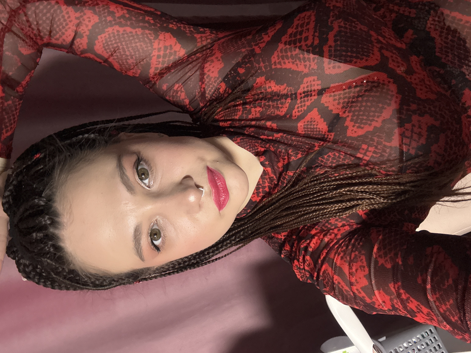 A young woman with light skin and brown braided hair is shown in a close-up shot, with her head tilted. She has a piercing in her nose and wears bright red lipstick. She is wearing a red and black snakeskin print top that appears to be somewhat sheer. The background is a mottled pinkish color. The setting does not clearly depict Saratov, Russia, and provides insufficient detail for precise location identification.
