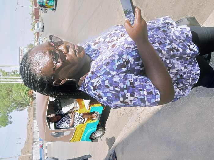 The image depicts an outdoor street scene in Communauté rurale de Payar, Senegal, under clear daylight. In the foreground, a woman with dark skin, braided dark hair, and dark-rimmed cat-eye sunglasses is shown from the chest up, angled slightly to her right. She wears a short-sleeved top with a blue, purple, and white geometric pattern and holds a black smartphone horizontally in her right hand. Her face and forehead exhibit a reflective sheen. Behind her, to the left, a yellow and blue three-wheeled auto-rickshaw with a brown fabric canopy is stationary by the roadside. Inside the auto-rickshaw, a second woman with dark skin is seated, wearing a white top with a dark pattern, with her legs crossed. The background reveals a paved multi-lane road with light vehicle traffic, utility poles, and distant hills or mountains. A "WELCOME MOTEL RESORT CENTRE" sign and a Coca-Cola sign are visible on the right side of the background.