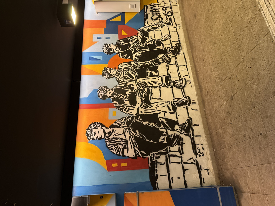 A mural depicts four silhouetted figures reclining against a backdrop of colorful, geometric shapes resembling buildings