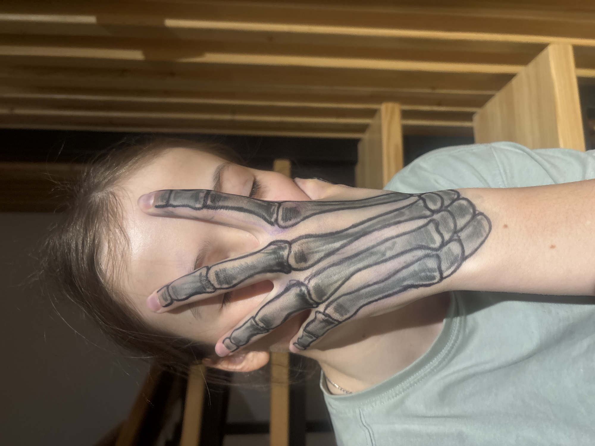 A fair-skinned young woman with light brown hair covers her face with her right hand, on which a grayscale skeleton hand is drawn. She wears a light green t-shirt and a silver necklace. The background is a wooden structure, possibly a loft bed or shelving unit. The location is unknown.