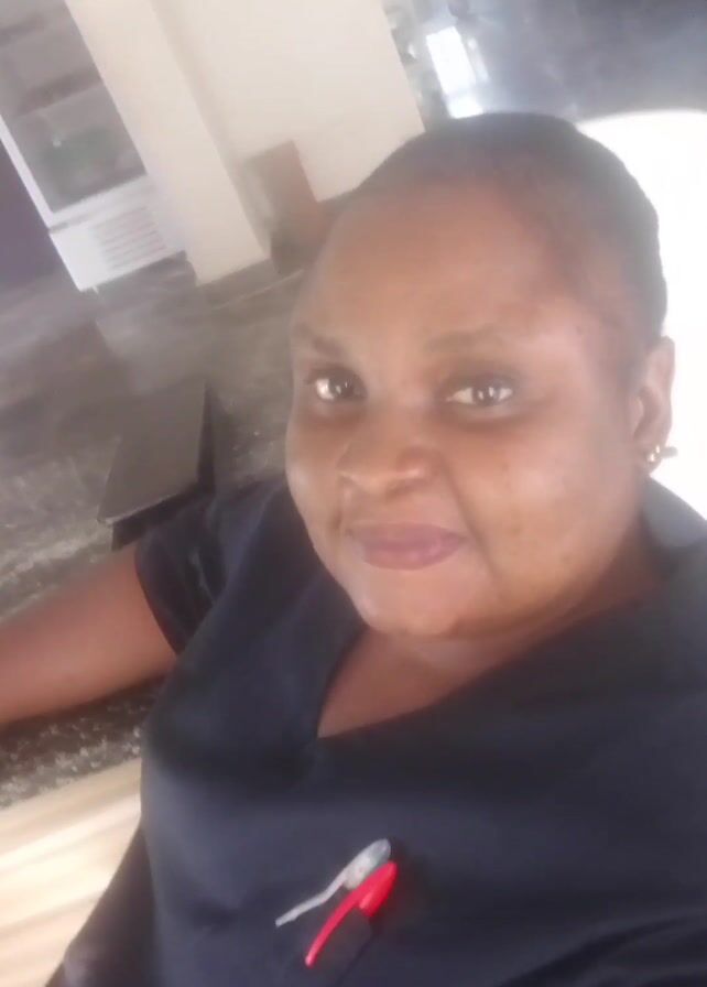 close-up selfie of a woman with brown skin and dark hair pulled back from her face. She is wearing a dark blue or black V-neck shirt with two small, pen-like objects clipped to the front. The woman has a calm expression and is looking directly at the camera. In the background, there are glimpses of a waiting area with chairs and other furniture, suggesting she may be in a public or professional space. The overall lighting is bright but slightly hazy.