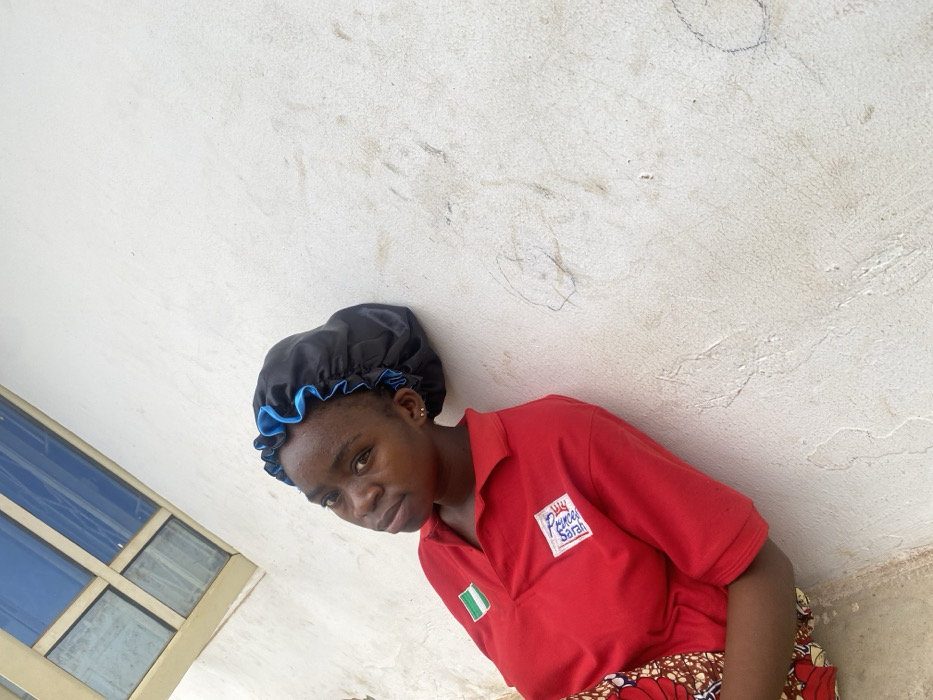 A young Black female is depicted in a medium shot, angled to her left, leaning against an off-white textured wall in the city of Nakuse, Nigeria. She wears a black satin bonnet with a blue ruffled trim and a red short-sleeved polo shirt. The polo shirt displays a Nigerian flag patch on the left chest and a "Princess Sarah" logo patch on the right. Small gold-colored stud earrings are visible. Her expression is neutral as she looks directly at the camera. In the upper left background, a multi-pane window with blue glass and a light-colored frame is present. The wall shows minor scuffs and faint, dark scribbled markings. A portion of a patterned fabric, likely a wrapper or skirt, is visible on her lower body.