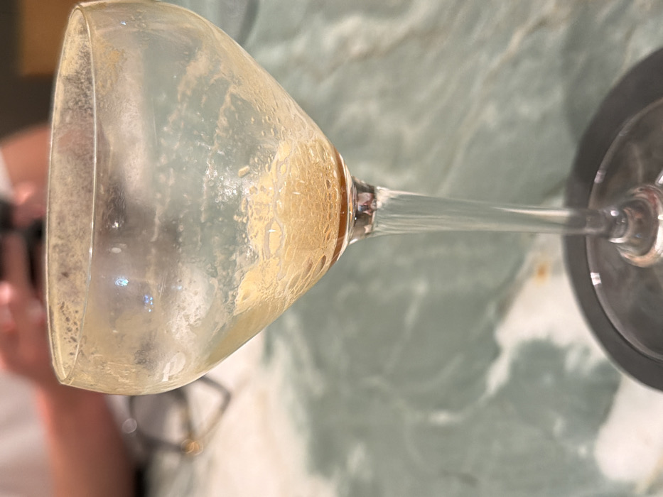 A partially consumed, long-stemmed cocktail glass sits on a light green surface with swirling patterns. The glass contains residual, dried beverage with a golden hue, clinging to its inner surface. The glass stem is clear and narrow, leading to a circular base. A person is partially visible in the blurred background, along with blurred objects like eyewear.
