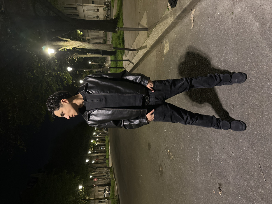 The image depicts a young male individual standing centrally on an asphalt street at night in Paris, France. The subject is a male with dark, curly hair, dressed in all black attire: a collared faux leather jacket, a dark grey three-button henley shirt, dark jeans, and black suede boots. A belt with a prominent silver-colored buckle is visible at his waist. He stands with his hands in his pockets, facing slightly to the viewer's left and looking towards the viewer's right. His shadow is cast behind him and to his right, indicative of a light source in front of and to his left. The environment is a tree-lined avenue illuminated by numerous classic Parisian streetlights emitting a warm, yellowish light. Mature trees with dense foliage line both sides of the street. On either side, beyond the trees, multi-story stone buildings with characteristic Parisian architecture are visible, likely residential or mixed-use structures. Raised sidewalks with curbs are present, and dark metal bollards stand along the right-hand sidewalk. In the distance on the left, parked vehicles are faintly discernible. A circular red road sign is also visible on the left side of the street further down. The scene is devoid of other visible people or active interactions, presenting a quiet nocturnal urban setting.