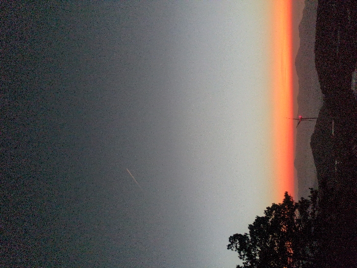 This image presents a panoramic view of a mountainous landscape during twilight, located in the city of Trường Thọ, Vietnam. The upper two-thirds of the frame are occupied by a noisy sky, displaying a gradient from dark grey at the top, transitioning to pale grey-blue, and then to a prominent horizontal band of vibrant orange and red along the horizon. A faint, diagonal white streak, possibly a contrail, is discernible in the upper-left quadrant of the sky. Below the colorful horizon, multiple layers of dark, silhouetted mountain ranges or hills recede into the atmospheric haze. A single wind turbine is silhouetted on a prominent hilltop in the mid-ground, slightly right of the frame's center, marked by a distinct red light at its hub. In the lower-left corner, the dark silhouette of dense tree foliage partially obscures the foreground. No human figures or direct human activity are observable. The scene is characterized by natural, low-light conditions, integrating an industrial structure into a serene, mountainous environment.