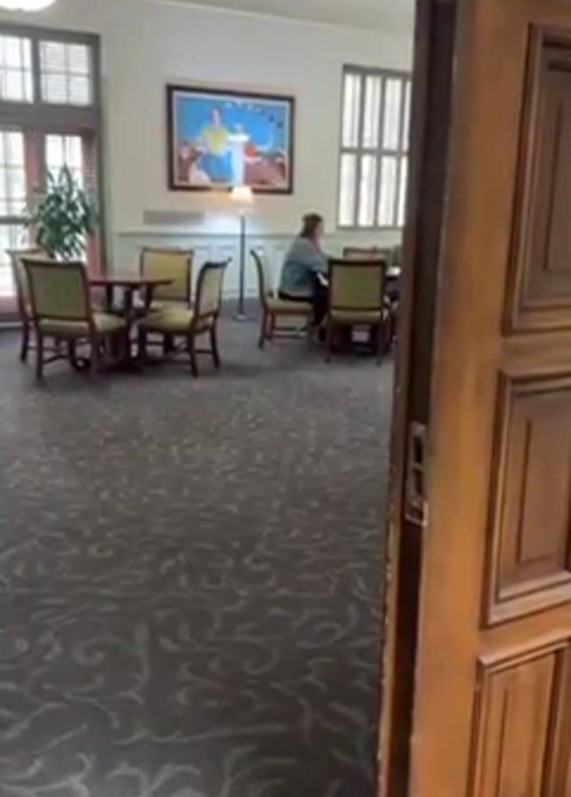 From behind an open wood door, a view of a lounge area is shown. The room has light-colored walls, a decorative ceiling, and a dark patterned carpet. Several round tables with four chairs around each are in the center of the room. A woman sits at one of the tables, facing away from the camera, apparently reading or working. Natural light streams in through large windows, some with closed blinds. A large painting hangs on the wall behind the seated woman. A floor lamp stands beside the painting. A potted plant is situated by one of the windows.