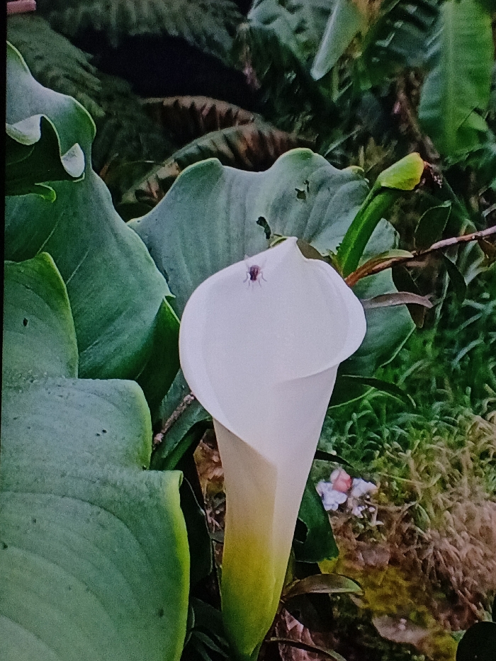 A close-up, vertical shot depicts a single white calla lily flower (Zantedeschia aethiopica) positioned slightly off-center to the right, in an outdoor natural environment in Unknown, Unknown. The flower exhibits a pristine white spathe transitioning to a pale yellow-green stem base. A small, dark-bodied insect, identified as a fly, is resting on the upper interior curve of the white spathe. The background is dense with various shades of green foliage, including several large, broad leaves partially framing the flower, some showing minor perforations. The lower right portion of the image reveals a mix of green ground cover and brown, dried vegetation. A small, fragmented object, appearing pinkish-white, is visible on the ground in the lower right quadrant. Lighting is uniform, indicating a diffused light source. No human subjects are present.
