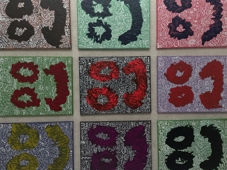 Nine square-format mixed-media art pieces are displayed in a 3x3 grid arrangement on a light-colored, flat wall. Each piece features a monochrome background with a dense overlay of intricate white doodle-style drawings, symbols, and text, resembling a street art aesthetic. Superimposed on the white doodles is a textured, three-part motif suggestive of a stylized face, consisting of two circular "eyes" and a curved "mouth," rendered in thick, contrasting paint. From left to right, top to bottom, the specific color combinations are: 1. Dark blue background, white doodles, olive green face. 2. Light green background, white doodles, dark red face. 3. Brown background, white doodles, dark brown face. 4. Black background, white doodles, dark purple face. 5. Black background, white doodles, bright red face. 6. Light green background, white doodles, dark blue face. 7. Light green background, white doodles, black face. 8. Lavender background, white doodles, dark red face. 9. Pink background, white doodles, dark purple face. The wall exhibits minor textural variations but no discernible damage. No people, active interactions, or additional objects are visible. The scene is located indoors in Guaynabo, Puerto Rico.