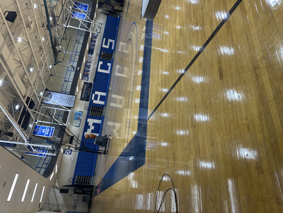 basketball court, likely inside a school gymnasium. The court has a polished wooden floor with blue painted lines, including a center line and a large circle. Seating lines the left side of the court, also in blue. The school name "HAWKS" is painted in large, white letters across the court. A basketball hoop and ball return system are visible on the left. Several banners and displays hang from the ceiling. The lighting is bright, reflecting off the glossy floor.