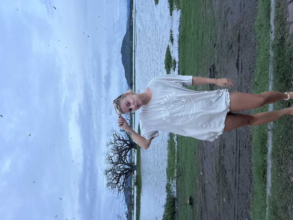A single female subject stands at the edge of the Tissa Wewa reservoir in Thissamaharama, Sri Lanka. She faces the viewer, maintaining a neutral expression with slightly pursed lips. Her right hand is raised, holding a pair of brown-framed sunglasses atop her head. A tattoo is visible on her left upper arm. She wears an oversized, light beige t-shirt featuring a circular graphic with the text "Salt Water Siargao," depicting a sun, waves, and surfboards. Dark shorts are partially visible beneath the t-shirt, and a white beaded anklet adorns her right ankle. The immediate foreground consists of dark, damp earth with visible tracks, transitioning to green grass on either side. The midground is dominated by the calm water of the Tissa Wewa reservoir, featuring scattered patches of green aquatic vegetation. In the background, two large, bare-branched trees are partially submerged in the water to the left. Distant green hills rise under an overcast, grey-blue sky. Numerous small, dark birds are observed in various stages of flight across the sky, predominantly in the upper half of the frame. Faint lights are visible on the distant shoreline.