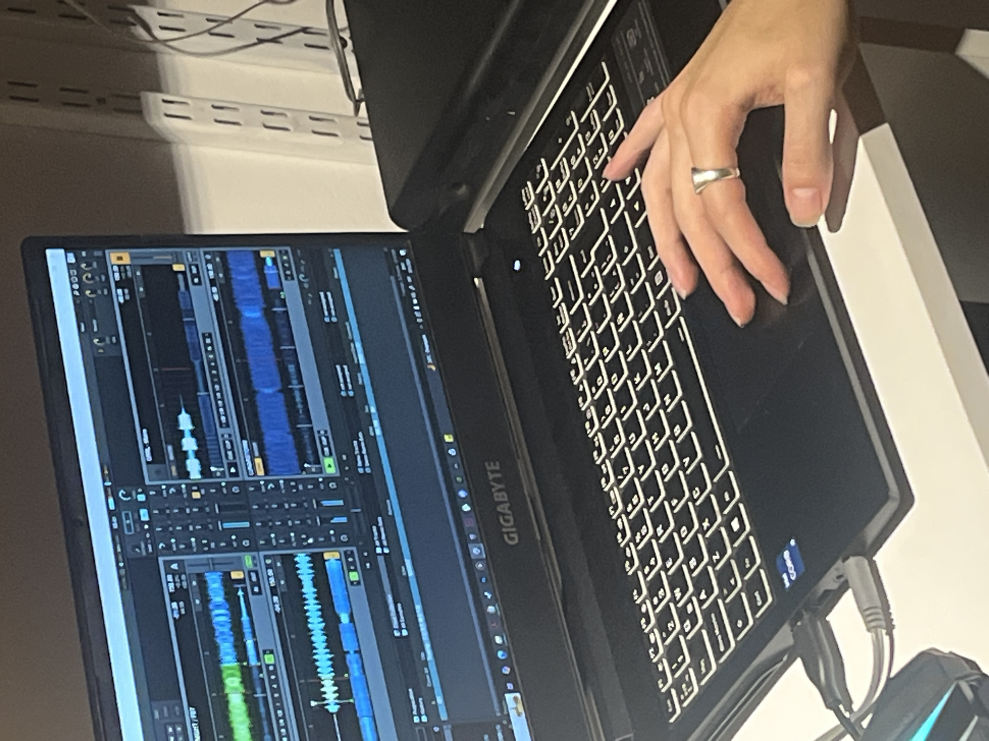 A person's hand rests on the keyboard of a black Gigabyte laptop, positioned on a white surface. The laptop screen displays audio editing software with various waveforms and controls. A silver ring is visible on the person's finger. Cables are connected to the laptop on the right side. The background shows a white wall. The location is unknown, and there is no information in the image that identifies the city of Buenos Aires, Argentina.