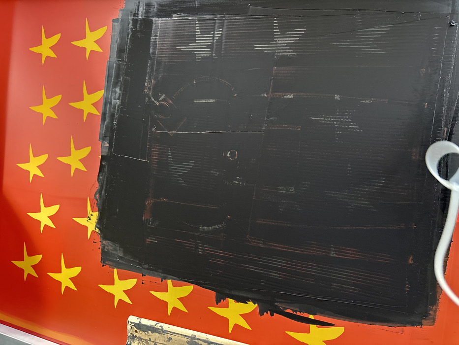 The image depicts a large, multi-layered artwork or display located in Macclesfield, United Kingdom. The underlying layer presents a bright red background densely patterned with numerous yellow five-pointed stars, strongly resembling the national flag of China. A substantial, roughly rectangular area of thick black paint or material heavily overlays the central and lower portions of this red and yellow surface. Visible through the black overlay are vertical striations, indicative of either an underlying corrugated texture or distinct brushstrokes. Faint reddish-brown undertones and ghosted outlines of circular and star-like forms are discernible within or beneath the black application. To the far left, a narrow, vertical object or frame segment with distressed metallic or gilded textures and white accents is partially visible. In the bottom-left foreground, a curved white ribbon rests partially on the black area. No individuals are present in the scene.