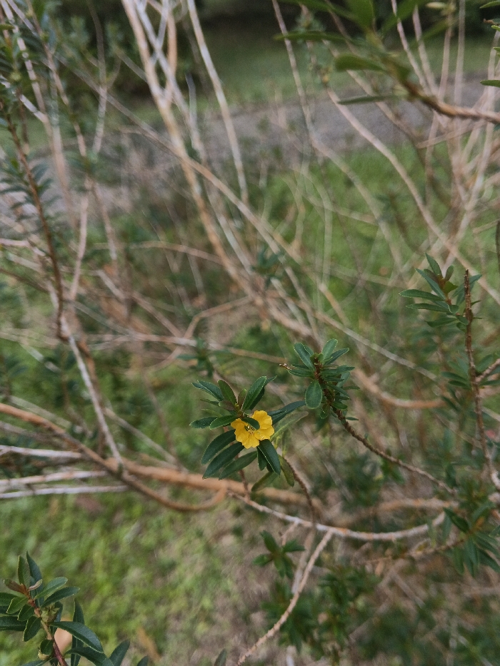 This image, taken in Munyati, Zimbabwe, depicts a close-up of a small, vibrant yellow flower centered on a branch with dark green leaves. The flower, approximately 1-2 cm in diameter, exhibits five discernible petals and a textured center. The branch it grows on is thin and reddish-brown. Surrounding the focal flower and its leaves are numerous other thin, bare, light brown to reddish-brown branches and some additional green foliage, all out of focus. The background consists of blurred green vegetation, likely grass, interspersed with more out-of-focus bare branches, indicating a natural outdoor environment. No people, animals, man-made objects, or specific actions/interactions are visible.