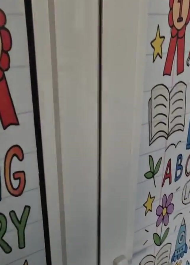 A person opens a white door covered in educational drawings, revealing a classroom with green walls and desks