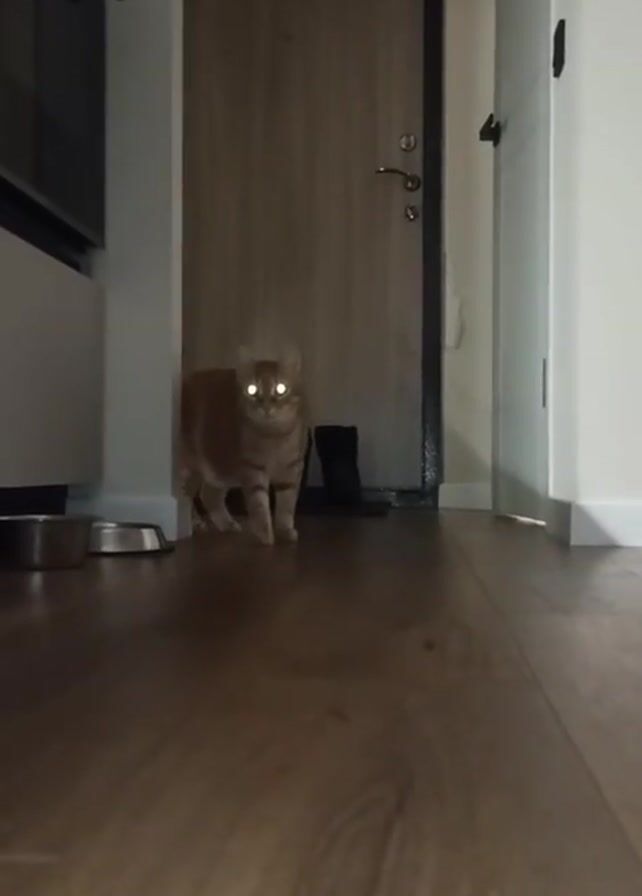An orange tabby cat stands on a wood floor indoors. The cat faces the camera, its eyes reflecting light strongly. The cat is flanked by two stainless steel dishes to its left. Behind the cat is a closed light-brown door, with a black rain boot and a doormat at its base. To the left of the cat is a portion of kitchen cabinetry, and to the right is a light-colored wall. The light is relatively dim. The camera is low to the ground.