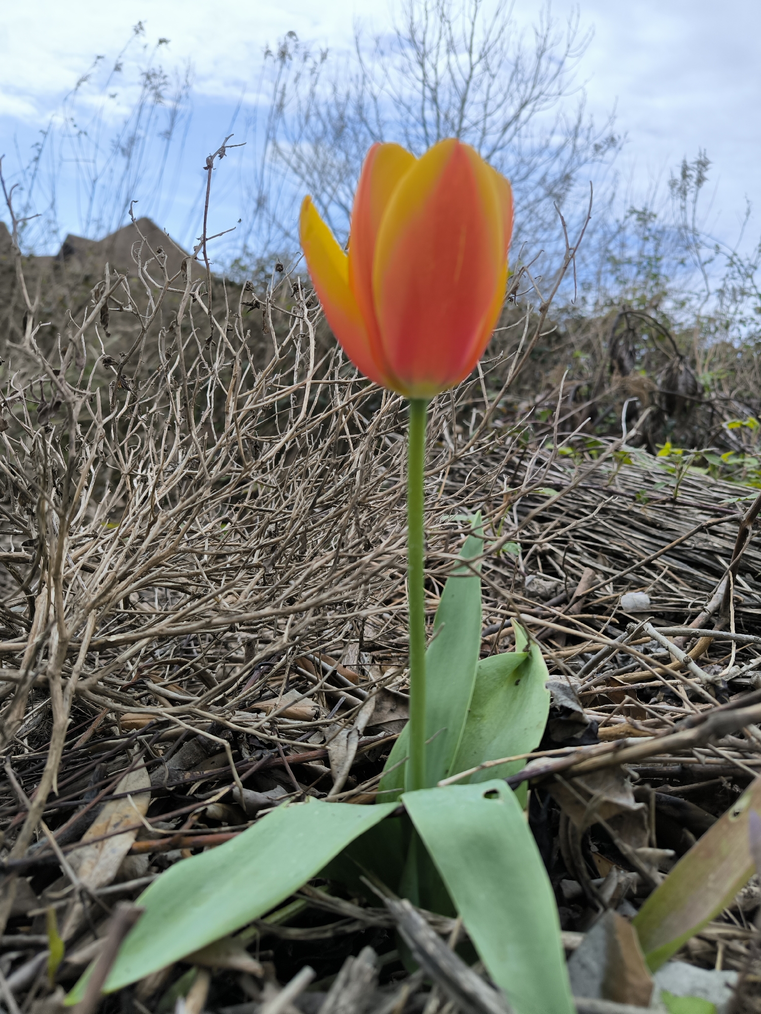 A single bicolored tulip, exhibiting yellow upper petals and orange-red lower petals, stands vertically in the foreground on a slender green stem with two broad green leaves at its base, one showing a small perforation. The ground is covered extensively with a dense matrix of dried, light brown branches, twigs, and dead leaves. In the midground, a thicket of leafless, intertwining dry branches forms a backdrop, with a horizontal stack of dried fibrous plant material visible to the right. The background features a partly cloudy, light blue sky, against which several bare deciduous trees with fine branches are silhouetted. Two distinct, dark, triangular rooflines of structures are discernible on the distant horizon. No individuals or actions are present. The documented location for this scene is Verkhnevesyoloye, Russia.