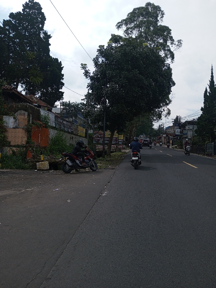 The image captures a street scene in Sandamal Eliya, Sri Lanka, under an overcast sky. On the unpaved left shoulder of an asphalt road, a dark red scooter is parked. A person wearing dark clothing and a helmet is seated on the scooter, facing towards the right. Behind this motorbike, a low, multi-colored concrete retaining wall is partially covered by green vegetation, above which a building with a tiled roof is visible. Tall, dark green trees stand prominently in the left background. On the asphalt road, which features a single solid yellow line on its right side, a dark-colored motorbike with a white rear license plate is moving away from the camera. The rider is clad in a dark jacket and helmet. Further down the road, several other motorbikes and at least one car are observed traveling in the same direction. Another motorbike is partially visible on the far right side of the road in the distance. The right side of the street is lined with buildings, utility poles, overhead wires, and various commercial banners, one of which partially displays the text "GENIE LET'S DO." Scattered trees, including a tall, slender coniferous tree, are also present along the right roadside.