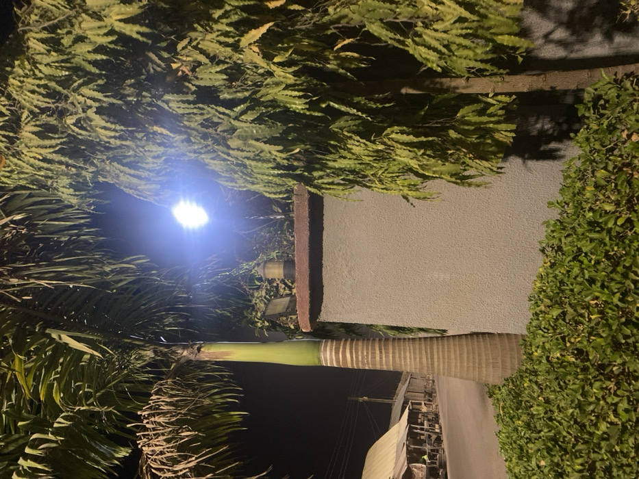 A nighttime scene features illuminated foliage above and to the sides of a light source