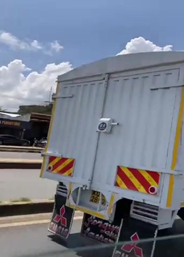 roadside scene. A white truck with a ribbed cargo bed is driving on a road. On the side of the road, there are low-lying plants. Across the road, a row of single-story buildings is visible, with a sign that reads "MARKANI FURNITURE." Several cars are parked in front of the buildings. Power lines run along the street. The sky is blue with fluffy white clouds. A tree is visible on the roadside.