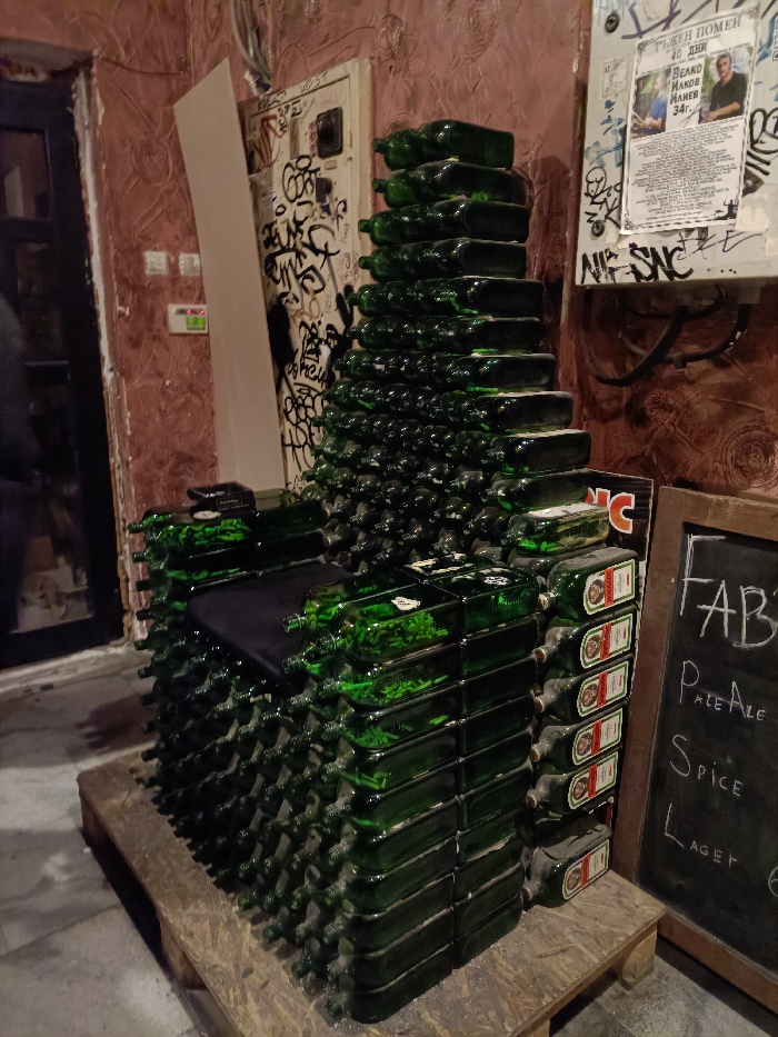 - "The scene captures an intricate, throne-like chair sculpture constructed from numerous stacked, empty, dark green glass bottles, predominantly Jägermeister bottles, resting on a wooden pallet in an urban setting" by FM-ZCHKv2, licensed under CC BY 4.0