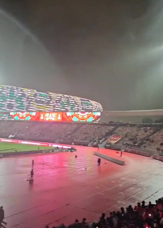 Here is a detailed description of the video: The video shows the interior of a large, partially covered stadium at night. The field is green with a red track surrounding it, and the seating areas are mostly full of people. The stadium has a large, modern structure with colorful LED displays along the top, showing various patterns and designs. Bright floodlights illuminate the field, and the sky overhead is dark and overcast. There are a few figures on the track level, possibly staff or security. The general atmosphere suggests a live event, likely a sports match, with visible spectators and lighting setup indicating an ongoing or recently concluded activity. The angle is from the lower seating area, likely captured by a spectator.