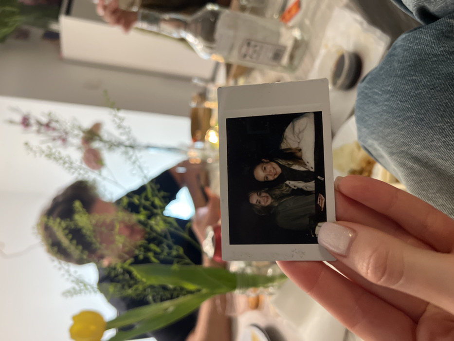 An indoor scene in Rafailovići, Montenegro, is depicted from a first-person perspective, focusing on a hand holding a small instant photograph. The photograph, held by a left hand with manicured light-pink fingernails, features two young adult females smiling. The woman on the left has light-colored hair and wears a light top, while the woman on the right has darker hair, a high-necked top, and a light-colored jacket. A small red object rests on a surface in front of them within the instant photo. The immediate foreground below the hand shows blue denim jeans. On a white tablecloth, a crumpled napkin and a small black container with dark liquid are visible. The background, largely out of focus, reveals a dining or gathering setting. To the left, a yellow tulip in a clear glass vase and a blurry male figure with dark hair in a black shirt are visible, seemingly looking at a device. A red soda can is near his position. To the right, another vase contains pink and green floral arrangements. A clear, mostly empty glass bottle is also present on the table, alongside other indistinct items suggesting a meal or social event.