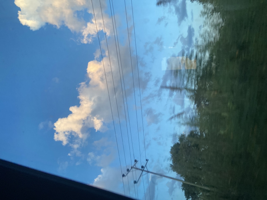 The image depicts an exterior view, likely captured from a moving vehicle, within the Parroquia Caucagua area of Venezuela. The scene is dominated by a vast blue sky occupying the upper two-thirds, interspersed with numerous cumulus clouds ranging from bright white with yellowish-orange highlights to muted grey tones. Five dark, parallel utility lines span horizontally across the middle of the frame. A single wooden utility pole, equipped with crossarms and supporting some of these lines, is positioned on the far-left, extending from the lower treeline into the sky. The lower third of the image features dense green vegetation, including taller trees in the mid-ground and a foreground of horizontally blurred foliage, indicative of motion. A dark, angled portion of a vehicle's window frame is visible on the extreme left edge. A rectangular reflection and faint vertical streaks are discernible on the transparent surface through which the photograph was taken. No individuals are present.