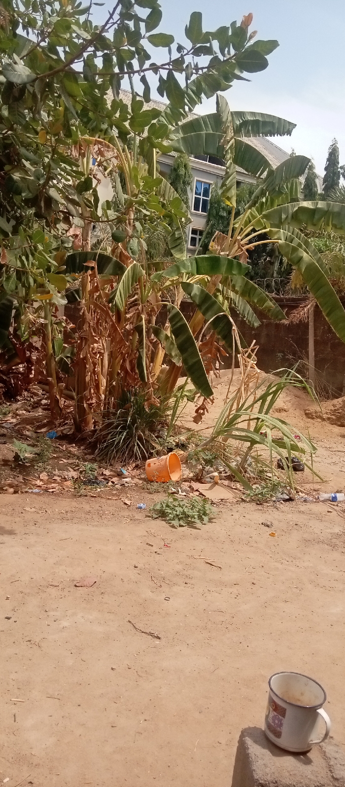 The image displays an unpaved outdoor scene in Rido, Nigeria, under a clear, pale blue sky. In the lower right foreground, a white enamel mug with a handle and faded, multicolored decorative patterns rests on a grey concrete block. The ground throughout the lower and middle sections of the frame is composed of light brown, dry dirt. Scattered across the midground are small patches of green weeds and various pieces of litter, including an orange plastic cup lying on its side, small plastic bottles, and wrappers. Behind this, a dense cluster of banana plants with large green and numerous dried, brown leaves and stems dominates the central and left portions of the frame. Other leafy green trees and shrubs are interspersed with the banana plants. In the background, partially visible through the foliage, is a multi-story building with light-colored walls and dark-framed windows, some reflecting the sky. To the right, a dark brown concrete wall topped with barbed wire is present. No people, animals, or active subjects are depicted.