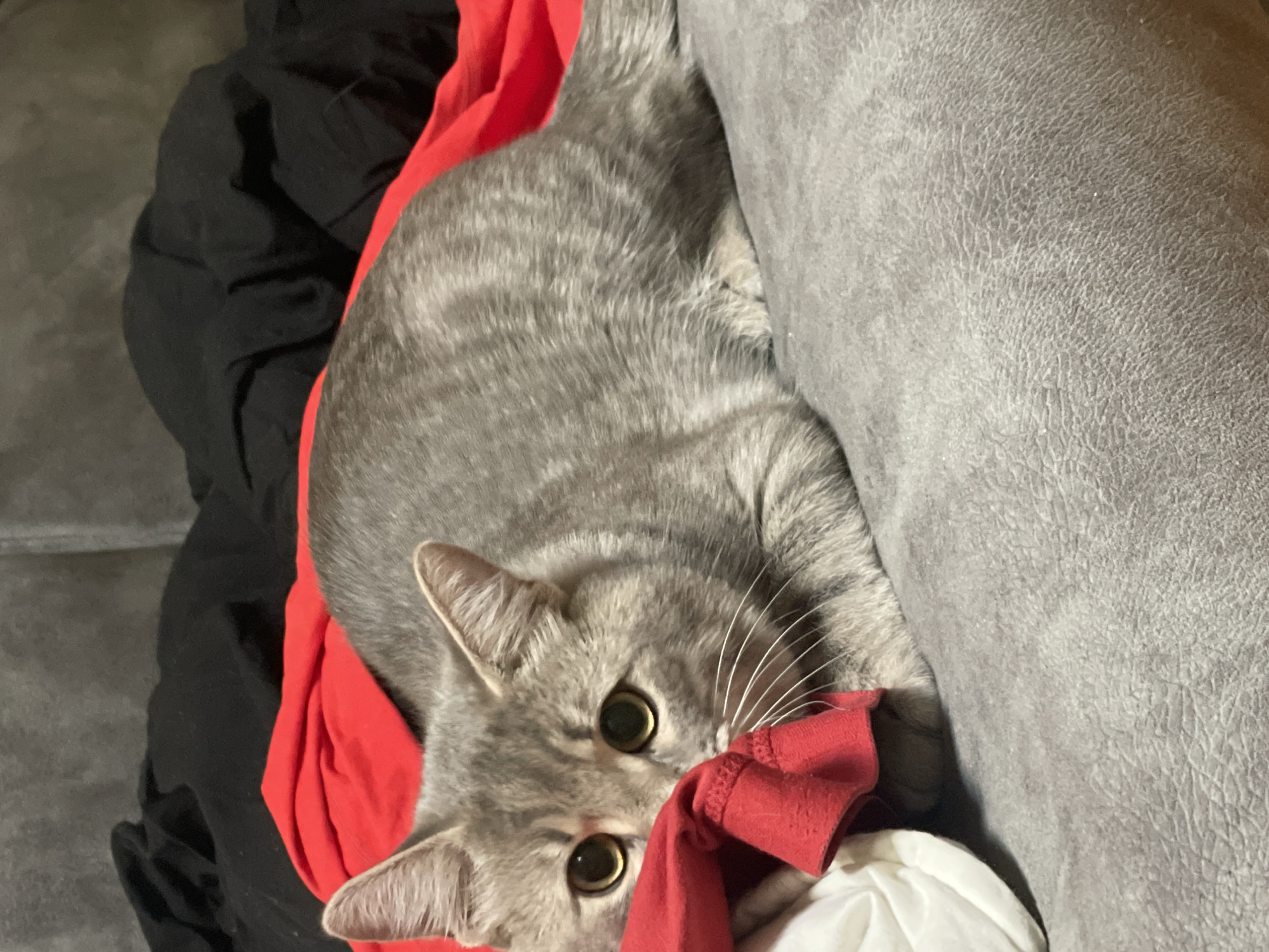 A grey tabby cat lies nestled between a grey sofa and piles of black and red clothing. The cat's large, round eyes are focused towards the camera. White whiskers extend from its face. A piece of red fabric is partially obscured by the cat. The background includes sections of a black garment and a grey sofa. No indication of location.