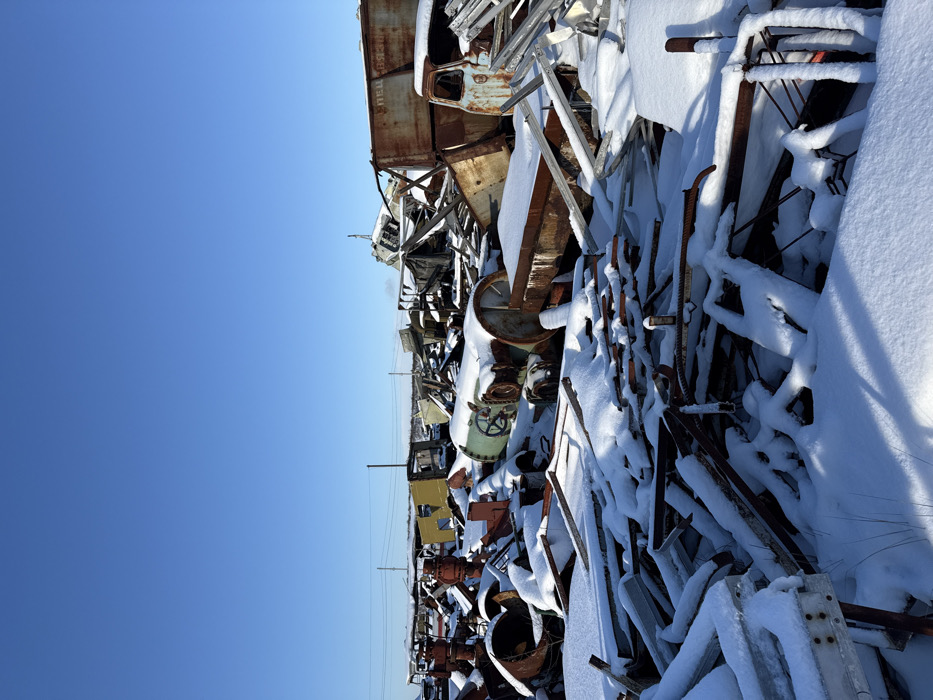 This image depicts a snow-covered industrial scrapyard located in Unknown, Ukraine, under a clear blue sky