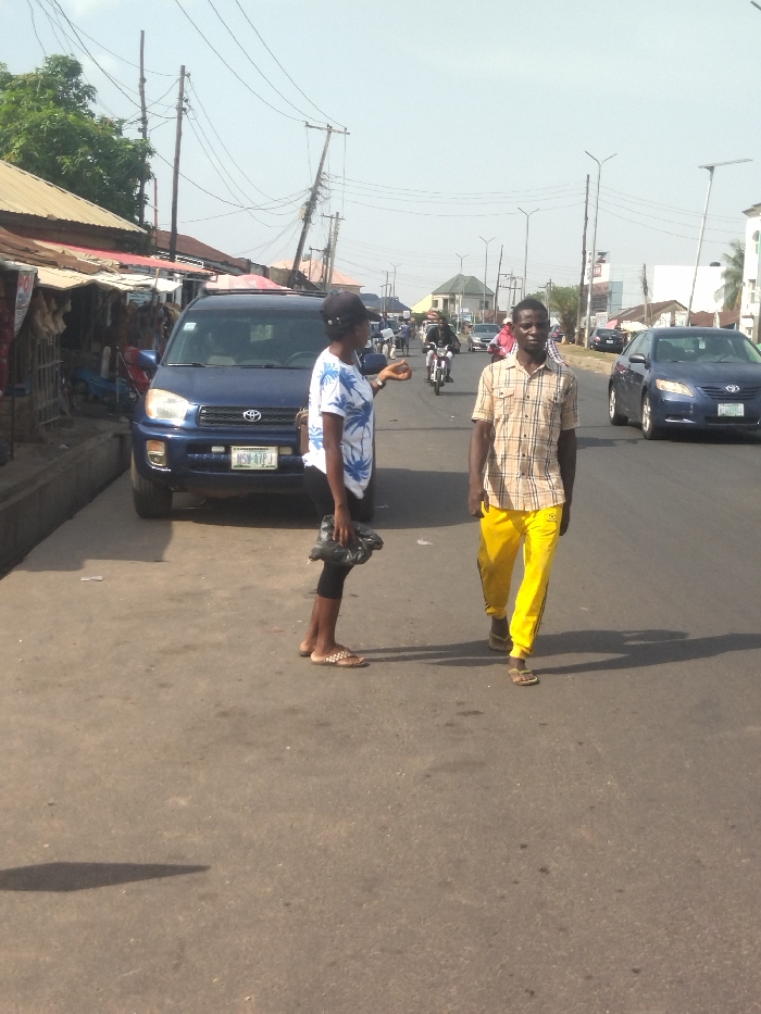street scene in New Karu, Nigeria, at coordinates 9.008 latitude, 7.573 longitude. Two people are walking in opposite directions on a paved road. The woman on the left is wearing a blue and white shirt, black leggings, and sandals. She is carrying a black plastic bag and is looking to the right. The man on the right is wearing a plaid shirt, yellow pants, and sandals. He is looking forward. A dark blue SUV is parked on the left side of the road, facing the camera. A light blue sedan is driving toward the camera on the right side of the road. There are other cars and motorcycles in the background. The scene is set under a clear, bright sky. The environment is typical of a suburban area in Nigeria. There are buildings on both sides of the road and power lines overhead. The pavement is cracked and worn in places. The scene is uncluttered and peaceful.