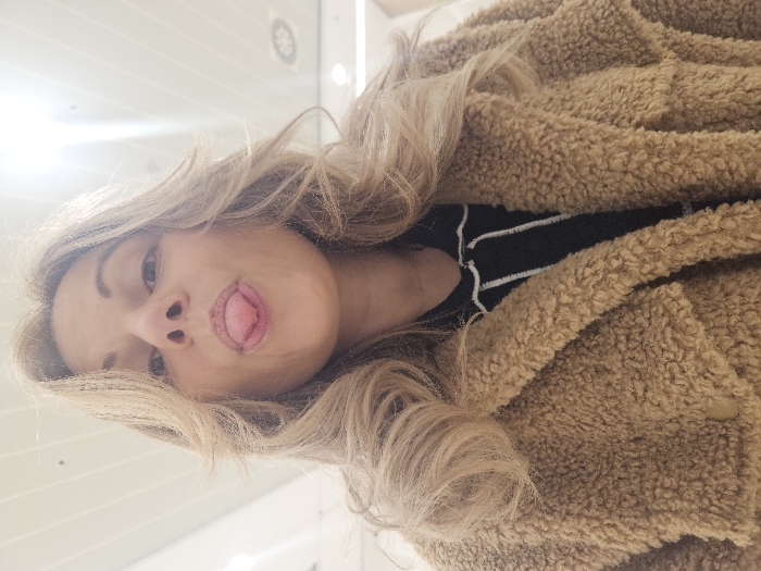 A close-up, upward-angle selfie depicts an adult female with blonde, wavy hair. She is seen from the chest up, looking directly towards the camera with her tongue extended and lips slightly puckered. She is wearing a light brown, textured "teddy bear" style coat over a dark garment with white striped detailing. The background is uniformly lit with bright, overhead artificial lighting, revealing a light-colored, possibly paneled or tiled, ceiling structure typical of an indoor public or commercial building. No specific architectural or contextual details are discernible to precisely locate the scene within the city of Burgas, Bulgaria.
