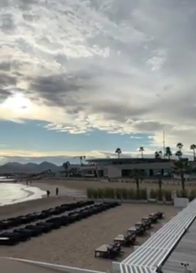 The camera pans slowly across a beach on a cloudy day. The beach is populated with rows of empty lounge chairs, both black and a more rustic brown, set out on the sand. In the distance, a modern building with palm trees sits beside the beach. People can be seen walking along the shore. Further out, a breakwater with small lighthouses extends into the water, and a sailing vessel is visible on the horizon. The sky is filled with dramatic clouds, with occasional glimpses of the sun breaking through. The camera appears to be positioned on an elevated platform.