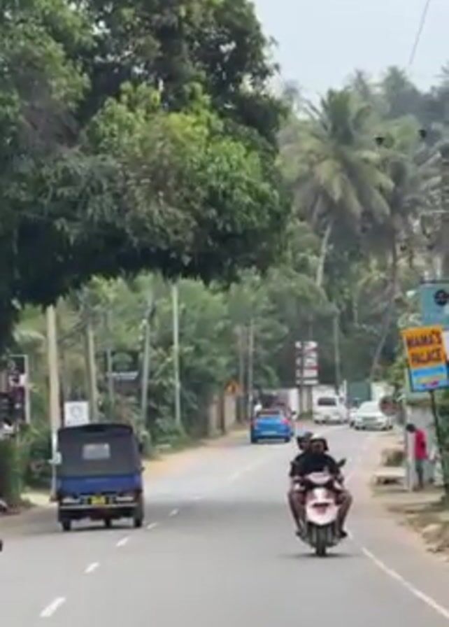 street scene in what appears to be a tropical location. Lush green trees and palm trees line the sides of the road. A blue tuk-tuk is traveling down the road, followed by a motorcycle. In the opposite direction, there are several cars and a scooter. A man in a red shirt is standing on the sidewalk. A sign for "Mama's Palace" is visible. Power lines stretch overhead. The sky is overcast, indicating potentially humid or rainy weather. The camera is moving, likely from a vehicle traveling along the road.