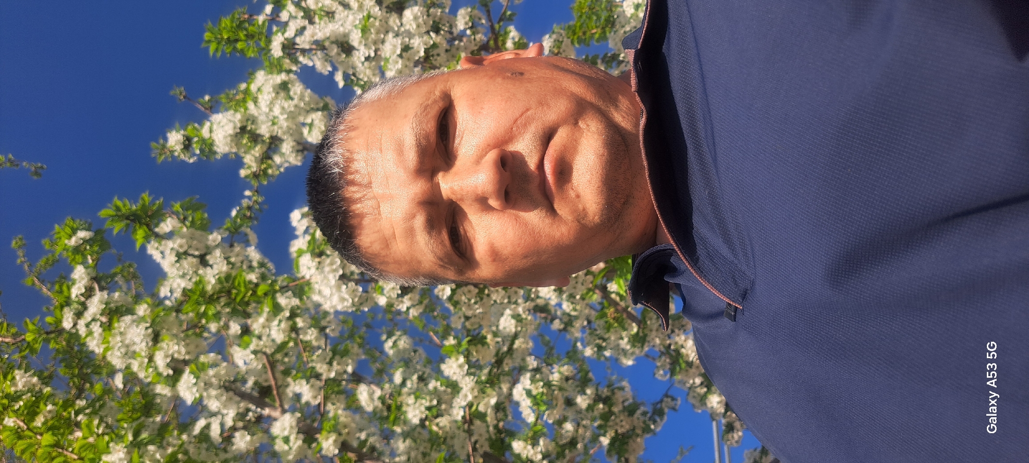 An adult male with short, dark hair mixed with grey stands in front of a tree covered in white blossoms against a bright blue sky. He is wearing a dark blue collared shirt. The image may have been taken using a Samsung Galaxy A53 5G. There is no explicit evidence in the image to confirm the location as Katta-Ravat, Uzbekistan.