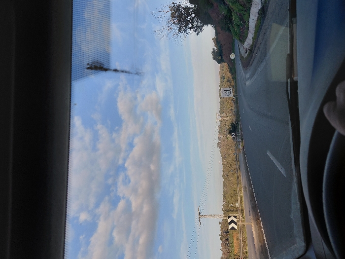 The image depicts a view from the interior of a vehicle, looking out through the windshield onto a curved road in Bni Yakhlef, Morocco