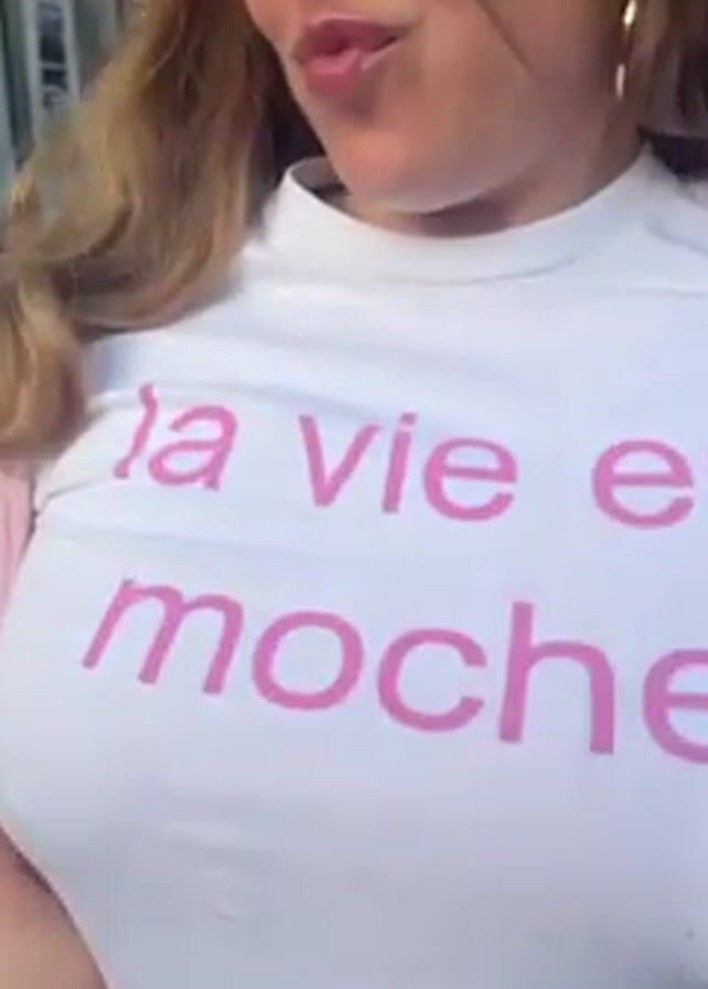 two women on a city street. The first woman is wearing a white t-shirt with pink lettering that reads "la vie en moche", a pink sweater, and large brown sunglasses. She purses her lips and poses. The second woman is wearing a red and white striped shirt, a green, white, and red hat, and a necklace with a cross pendant. She looks at her phone and then directly at the camera with a serious expression. The background includes buildings, trees, other pedestrians, and a parked car.