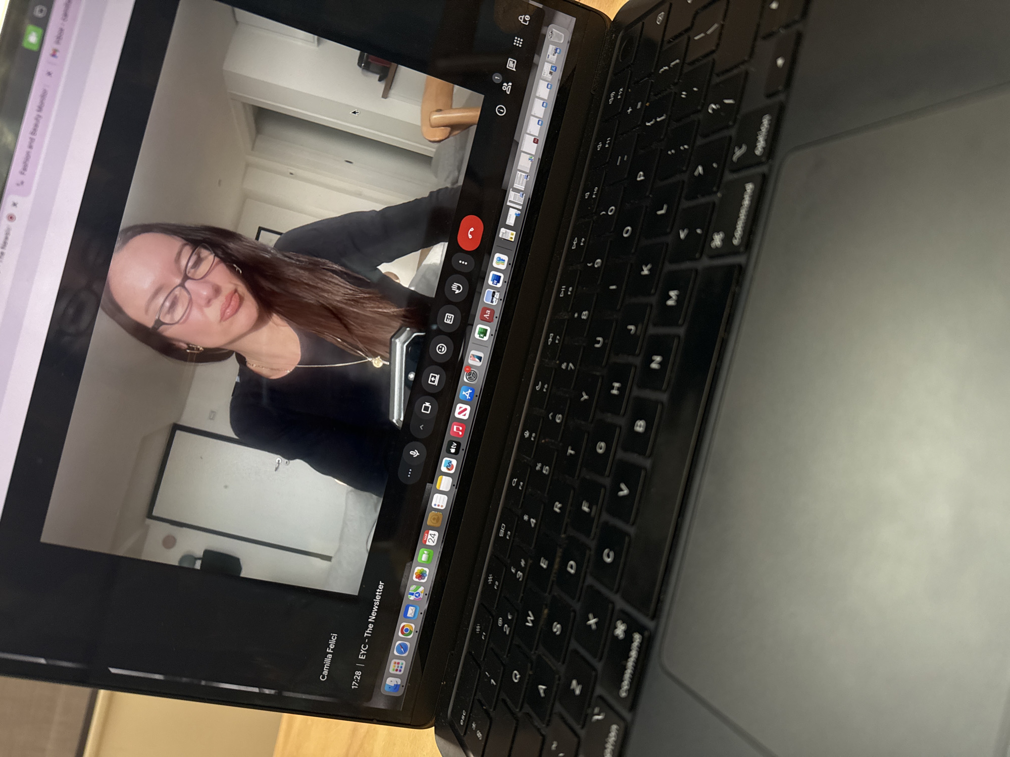 A MacBook laptop rests on a light-colored wooden surface, angled slightly from the top-down perspective. Its screen displays an active video conference or presentation. The primary subject on the screen is a female identified as "Camilla Felici," shown from the chest up. She has long dark hair, wears dark-rimmed glasses, a dark long-sleeved top, and a gold-colored necklace with a round pendant. Her expression is neutral. The on-screen time reads 17:28, and the event is titled "EYC - The Newsletter." The background behind Camilla consists of light-colored walls, a white door with a dark frame, and a grey sofa or bed. A dark, square object is mounted on the wall to the left of the door, and a wooden furniture piece is partially visible on the right. Below the main video on the laptop's screen, the macOS Dock displays numerous application icons. Browser tabs visible at the top reference "Fashion and Beauty Monitor" and an "Invoice - camilla." The laptop's black keyboard with white lettering and a grey trackpad are prominent in the foreground. The scene is located in Milan, Italy.